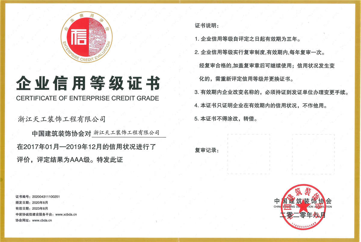 浙江天工裝飾工程有限公司成立于1994年,是一家專注于建筑行業(yè)近三十年,余杭區(qū)內(nèi)規(guī)模最大、最專業(yè)的現(xiàn)代化專業(yè)承包企業(yè),連續(xù)十二年榮獲“余杭區(qū)建筑業(yè)十強企業(yè)”稱號。公司現(xiàn)任余杭區(qū)建筑裝飾行業(yè)協(xié)會會長單位、杭州市建筑裝飾行業(yè)協(xié)會副會長單位、浙江省建筑裝飾行業(yè)協(xié)會副會長單位、中國建筑裝飾協(xié)會理事單位。公司具備建筑裝修裝飾工程專業(yè)承包壹級、建筑幕墻工程專業(yè)承包壹級、建筑裝飾工程設(shè)計專項甲級、建筑幕墻工程設(shè)計專項甲級、展覽陳列工程設(shè)計施工一體化貳級、電子與智能化工程專業(yè)承包貳級、消防設(shè)施工程專業(yè)承包貳級、防水防腐保溫工程專業(yè)承包貳級,集建筑工程施工總承包、建筑機電安裝、城市及道路照明、鋼結(jié)構(gòu)、結(jié)構(gòu)補強、安防施工等多項資質(zhì)。主要從事大型公共建筑、星級酒店的室內(nèi)精裝修、建筑幕墻及建筑智能化工程的設(shè)計與施工。 天工裝飾始終把建筑裝飾當作一項 “美的事業(yè)”,在施工中嚴把質(zhì)量關(guān),不斷規(guī)范和提升工程技術(shù)標準。近年來,公司承建的浙商開元名都國際酒店I標段裝飾工程、杭州藝尚雷迪森廣場酒店裝修工程、余杭區(qū)時代廣場5號樓(市民之家)室內(nèi)裝飾工程、永安之星室內(nèi)裝飾工程、青山湖科技城創(chuàng)業(yè)廣場裝修工程、杭州未來科技城醫(yī)院室內(nèi)裝飾工程、杭州師范大學附屬實驗學校裝修工程、杭州老板電器股份有限公司辦公樓裝飾工程、深川控股集團綜合樓幕墻工程、浙江省科技信息研究院幕墻工程、北航杭州創(chuàng)新研究院(余杭)內(nèi)裝及智能化提升改造項目(研究生院)工程、臨平新城人才服務(wù)中心設(shè)計釆購施工(EPC)工程總承包項目、浙江大學先進電氣裝備創(chuàng)新中心室內(nèi)外裝飾及改造項目設(shè)計采購施工(EPC)工程總承包項目等,先后獲得“中國建筑工程裝飾獎”、“全國建筑裝飾科技創(chuàng)新獎”、浙江省建設(shè)工程“錢江杯”優(yōu)質(zhì)工程獎、杭州市建設(shè)工程“西湖杯”優(yōu)質(zhì)工程獎、嘉興市建設(shè)工程“南湖杯”優(yōu)質(zhì)工程獎、“浙江省優(yōu)秀建筑裝飾工程獎”、“浙江省優(yōu)質(zhì)安裝質(zhì)量獎”等榮譽。 天工裝飾恪守“誠實守信、文明經(jīng)營”,近年來公司得到了客戶的信賴也獲得了業(yè)界的好評,先后被評為“國家級守合同重信用單位”、“全國建筑裝飾行業(yè)AAA級信用企業(yè)”、“全國百家科技創(chuàng)新型企業(yè)”、“浙江省AAA級守合同重信用單位”、“人民銀行信用等級AAA級企業(yè)”、“浙江省信用管理示范企業(yè)”、“浙江省誠信企業(yè)”、“浙江省建筑裝飾行業(yè)強優(yōu)企業(yè)”、“杭州市建筑業(yè)優(yōu)秀企業(yè)”、“余杭區(qū)建筑業(yè)十強企業(yè)”、 “余杭區(qū)人民政府質(zhì)量獎”等榮譽。